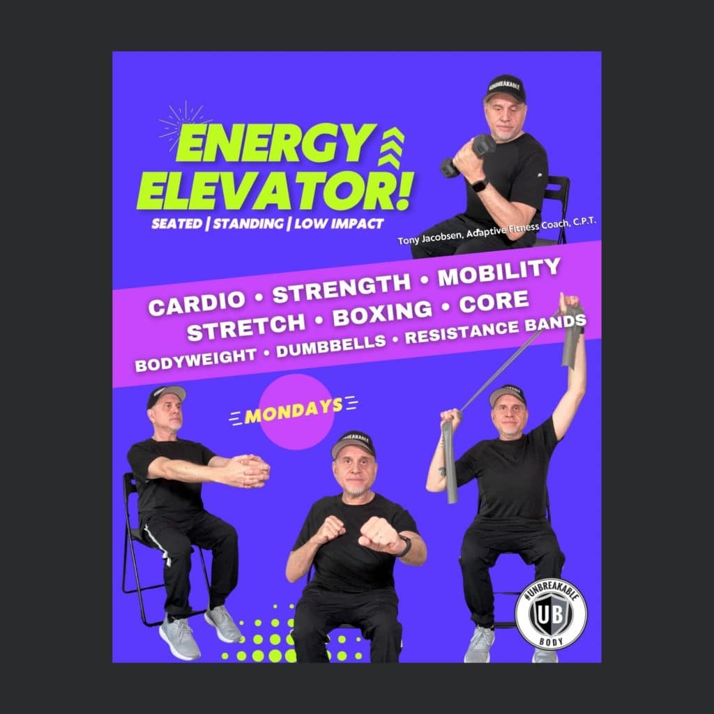 Join me live for a 30-minute adaptive workout you can do seated or standing. Each week features a different focus — strength, cardio, boxing, mobility, or stretch — so you’ll always get something fresh and effective.